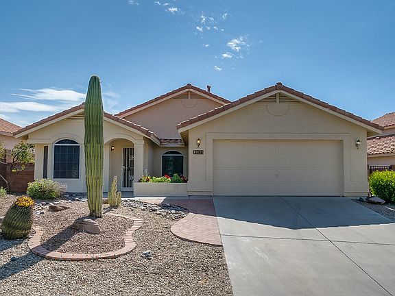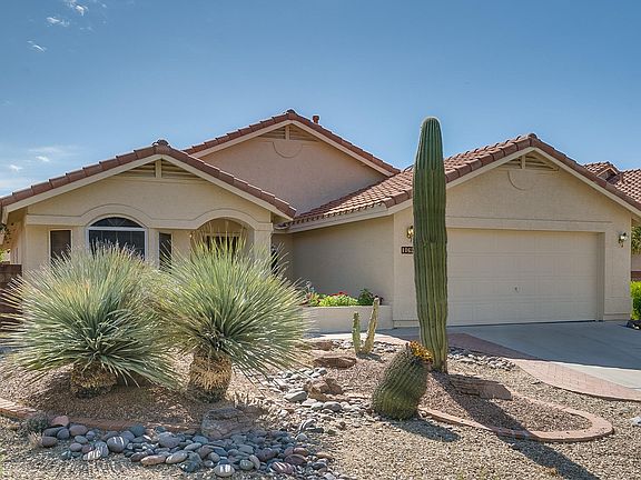 Spacious rooms, tall ceilings and natural light enhance this 3 bedroom plus office/den home in a convenient and established Oro Valley location. A large living room welomes you home. The family room adjacent to the kitchen offers a gas fireplace and the flow of the floorplan is good for entertaining. The sliding glass door offers a glimpse of the water fountain in the backyard. Dual sinks in both the master bath and the guest bath. Established landscaping in the backyard, covered patio, flower beds, brick pavers, citrus trees and a very picturesque waterfall feature. Peek-a-boo views of the mountains.