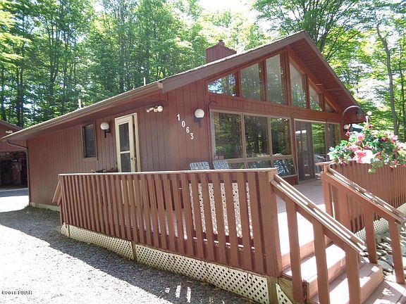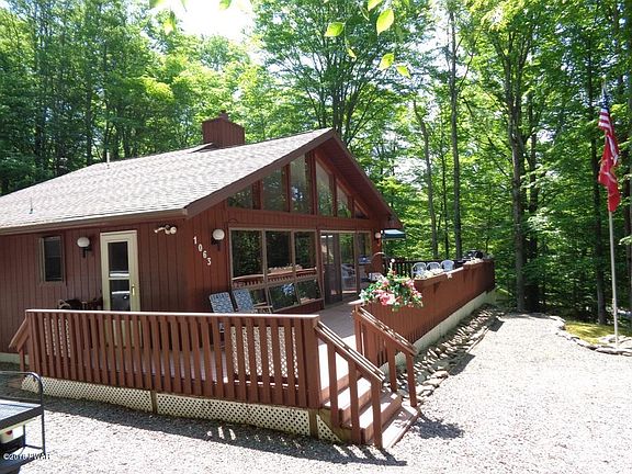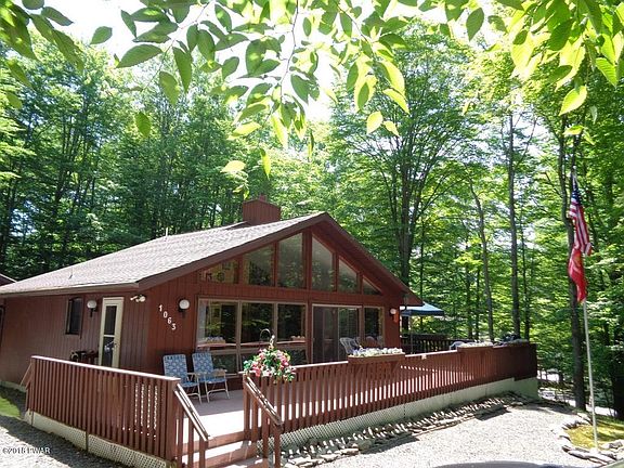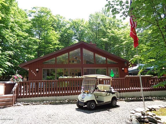 Excellent Location! Lake Rights. Large one level Chalet with detached garage and workshop. A special place for her and for him! Meticulously maintained. Lots of light. Open Kitchen, dining area and living room with stone fireplace. Extra large master suite, 3 bds, 2 full baths. Huge wrap around trex deck. Utility shed. Lots of parking and storage areas. All this, and just a short walk to motor boating Lake Wallenpaupack! Enjoy 3 lakes, outdoor and indoor pools and much more! Commutable distance to NYC and major metro area. No work to do, move right in, turn key, everything there just waiting for you!