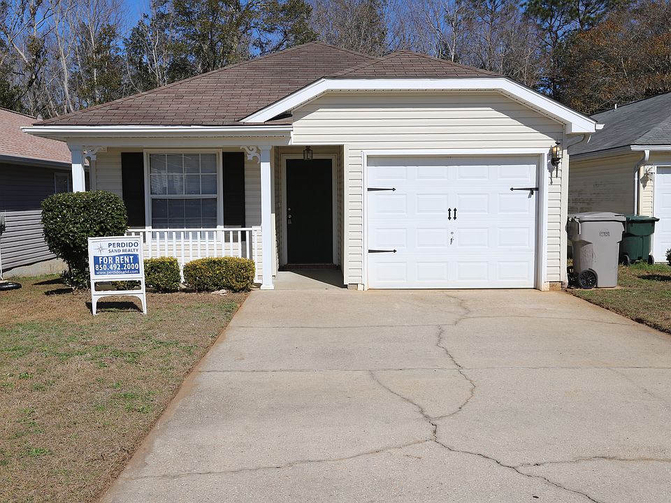 Quaint 2/2 convenient to I-10, NAS Corry Station, Naval Hospital and downtown. Kitchen with refrigerator, built-in microwave, dishwasher, stove and breakfast bar. Living / dining combo. Living room with access to the 12x24 covered porch that looks over the large peaceful back lawn and wooded area. Master with walk in closet, trey ceiling and ceiling fan. One car-garage. Fenced back yard . Sprinkler system. Washer and dryer and extra refrigerator in the garage convey AS IS - homeowner not required to replace or repair them. Walking distance to the community play area and pavilion. Homeowner prefers no pets, but may consider small animals. All utilities are on the tenant. No Smoking in the home, No parking on the grass