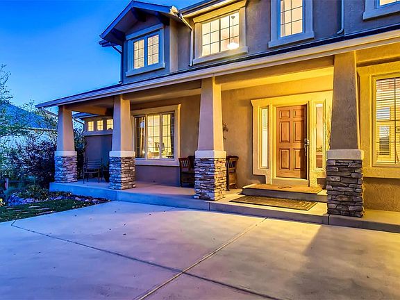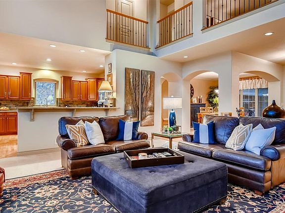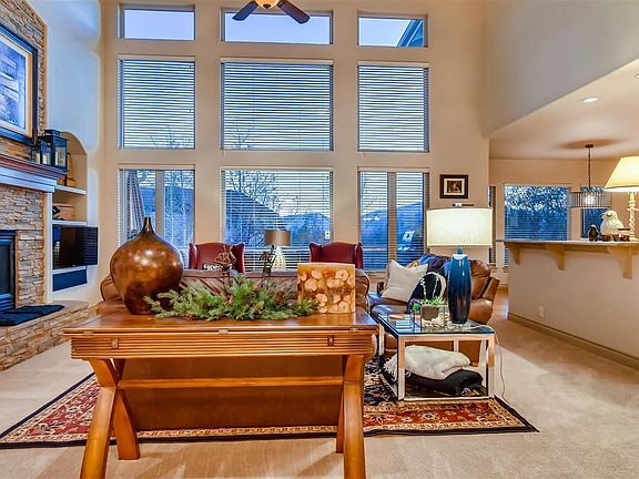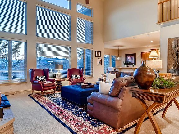 Privacy and Pikes Peak view in this magnificent Symphony Homes two-story with Walk-out lower level at end of cul-de-sac. Property offers rare combination of a location close to parks, trails, shopping and amenities, with mature-landscaped setting offering ambiance of a more secluded environment. Enter through the Covered Front Porch to a Dramatic Great Room offering a Wall of Windows to the stunning Pikes Peak View, and a Stone Fireplace Mantle with built-in shelving. Updated Kitchen/Breakfast Nook adjoins Great Room, with Hickory Floors and Cabinets, Granite Countertops with Tile Backsplash, Center Island with Gas Range, and Oven, Microwave and Refrigerator. Formal Dining Room adjoins the Great Room. Wake up to the Pikes Peak View in the Main Level Master with Radiant-Floor Heat, Two-Sided Fireplace, then walk-out to the Stained and Treated Deck with Piped Natural Gas for Barbeque, overlooking the Expansive Garden with Fire Pit, Mountain View, and Park Like Setting. The Master Bath includes Ceramic Tile Floors and Countertops, Double-Vanity, Two-Headed Shower with Tile Backsplash, and Huge Walk-In Closet. Glass Brick Windows next to Soaking Tub illuminate master bath with privacy and flair. Three Bedrooms upstairs, one with Ensuite Bath, the other two sharing another Full Ensuite Bath with Double Closets and Vanities. Lower Level is great for entertaining, with huge Great Room containing Full-Wall Stone Fireplace Mantle, Game Room, and adjoining Wet Bar with Ceramic Tile Counters, Knotty Alder Cabinets, Dishwasher and Fridge. Executive Office and Workout Room with Dry Sauna (both are easily converted to Bedrooms), along with Home Theater Room, are great for Work and Play without ever leaving home. Only 5 minutes from Flying Horse Athletic Club/Spa/Golf Course, I-25 and Premier Retailers and Restaurants in Copper Ridge and Interquest Marketplace. Only 40-minutes to metro Denver. Come see this Truly Beautiful Home, you're going to love it!