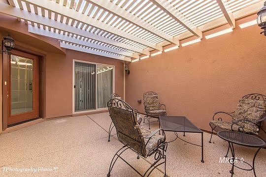 Don't delay in your opportunity to own the greatly desired Iris floor plan at Sun City Mesquite! Located in Split Rail, just steps away from all the wonderful amenities that Sun City Mesquite has to offer! The very popular Iris model is a 2 bedroom and office floor plan, that also offers a gated courtyard in the front that has access straight into the kitchen as well as an extended two car garage for extra toys or storage! This home has been updated to include a pergola patio in the front courtyard as well as the rear courtyard, privacy glass block wall on the back patio, a beautifully tiled walk in shower in the master bedroom with granite countertops throughout and epoxy flooring in the garage and patio areas. Elevated and positioned for unobstructed views, extending from the Southern mountains to the Mesquite Mesa!