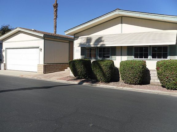 Beautiful 55+ Gated Community with panoramic views of surrounding mountains,. One of the largest homes in Desert Sands Mobile Home Park. Triple wide with 2 car garage. Spacious living room/den, family room and dining room areas with laminate flooring. Living room can be used as a 3rd bedroom. Family room has wall-to wall glass windows with French doors that lead to a covered patio perfect for entertaining. Upgraded bathrooms with the Master bath having dual sinks and an oversized shower. Mature landscape in the large backyard. Great home at an affordable price. Desert Sands is a gated senior community, with pool, spa, sauna, clubhouse, fitness room, pool tables, card room, meticulous grounds and onsite management. Conveniently located only minutes from nearby shopping, dining, airport, casinos and more.