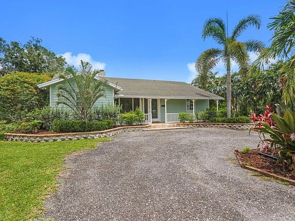 This charming, light and bright, single level, pool home is on a 1.25 acre, fenced lot on paved roads in Jupiter Farms.It has a long circular driveway, nice covered front porch, and a detached 24x36 steel garage with 11'x12' door - perfect safe hurricane storage for your cars/toys. The exterior is all hardiboard and inside you will find beautiful engineered wood and tile. The updated kitchen features granite counters, s/s appliances, and pullout drawers. Kitchen opens to a bar with separate sink and wine refrigerator - perfect for entertaining. Other features include all new 2017 Trane A/C and ductwork, large laundry room, wood burning fireplace, built in closets, screen enclosed pool, custom built tree-fort, garden, and fire pit. The 11x14 master closet could be easily used as an office