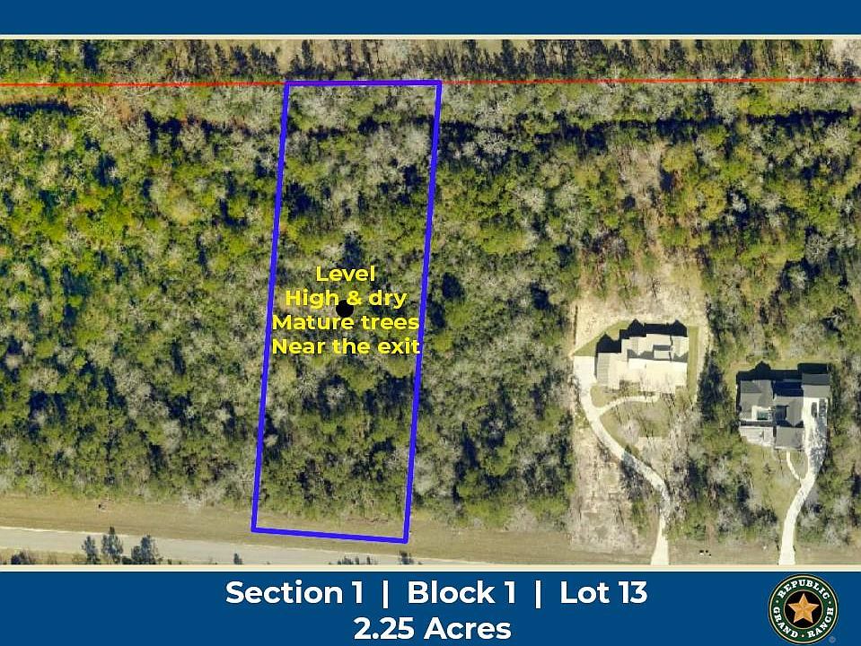 This 2.25-acre flat homesite in Republic Grand Ranch offers excellent accessibility, usability, and privacy. Located near the front of the community for quick access to I-45, this wide homesite features a canopy of mature trees, a level building area, and no rear neighbors. Positioned at a high elevation, the land is outside known flood zones and offers solid drainage. All utilities are in place including underground electric, water, fiber optic internet, and paved road access- ready for your new build. Republic Grand Ranch supports custom home construction through a list of ten approved builders. This community offers a stocked private lake, trails, parks and covered pavilions for all of your family gatherings and picnics by the lake. Just minutes away, Lake Conroe offers boating, fishing, and waterfront recreation, while The Woodlands, hospitals, shopping, and schools are less than 20 minutes away.