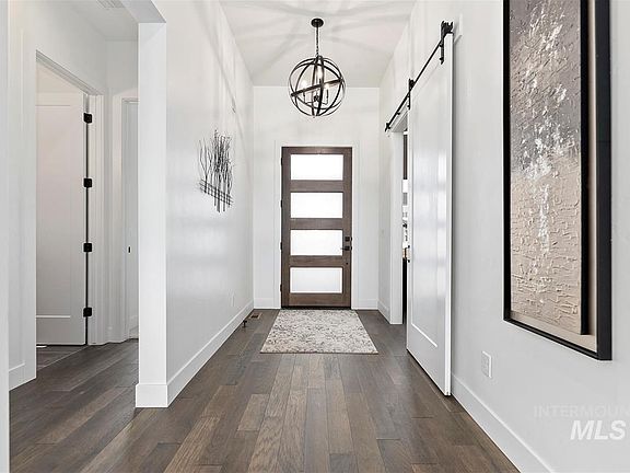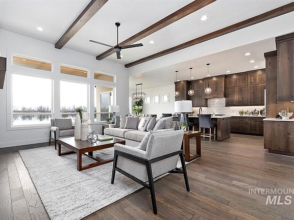 Picturesque setting backing to a spacious lake framed by the abundance of trees along the Boise River in the background where you'll find wildlife, plethora of open space and more! Enjoy your private beach area along the lake & prepare to be captivated by the impeccable views & endless recreational possibilities. This single level home by Shadow Mountain Homes, is thoughtfully designed & provides an efficient layout. The owners' suite features an expansive space overlooking the lake, offering walk in closet connection to the laundry room, a luxurious bathroom w/ walk in tiled shower & double vanity. Spacious kitchen w/ designer appliances, huge pantry & open concept layout connecting to the beautiful great room, all with a grand view to the lake. Home Features an oversized garage with large extra shop or storage room. Photos similar.