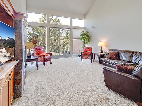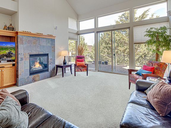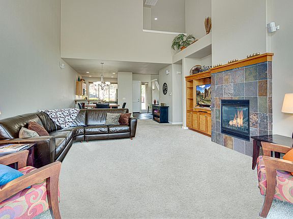 Gorgeous townhome in Creekside Village @ the Ridge at Eagle Crest. Luxury finishes, floor to ceiling windows & tons of natural light in this Great Room plan w/vaulted ceilings. Classic slate tile entry, carpeted main living area w/slate adorned fireplace w/built-in entertainment center. Kitchen ftrs granite counters, plenty of cabinetry & breakfast bar seating. Kitchen is open to dining area w/views out to the patio & beyond. Main level Primary bedroom has desirable separation w/sliding doors out to the patio. Tiled primary bath w/dual vanity, corner soaking tub, step in shower & laundry ensuite. 2 addtnl bedrooms upstairs share a full bath & loft area/office space. Outdoor paver patio offers plenty of room for entertaining & enjoying your morning coffee; storage areas off patio & front entry. All appliances included. Enjoy golf, tennis, pickleball, swimming & miles of trails for hiking & bicycling. Don't miss this one, ideal for full time residence, vacation home or short term rental!