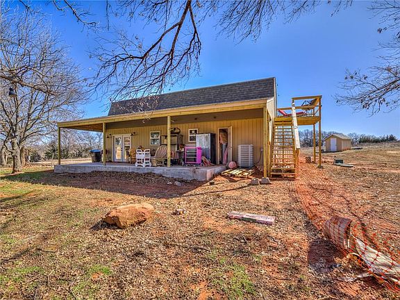 Over 6 acres with a 2 bed 1 bath home in Mcloud for SALE. Home has 2 nice size bedrooms. 1 on each floor. the bathroom has a nice tub and separate shower downstairs. The kitchen is spacious with a bar to eat at and prep food, providing extra counter space. There is 2 living areas one for each floor. The back patio is covered and perfect for taking in the outdoors. The deck off the 2nd floor bedroom is perfect for taking in the Oklahoma sunsets. Nice size storage shed with electric to it. The property also owns part of the pond on the back side of the property! Do not miss your opportunity to see this one call today for a showing.