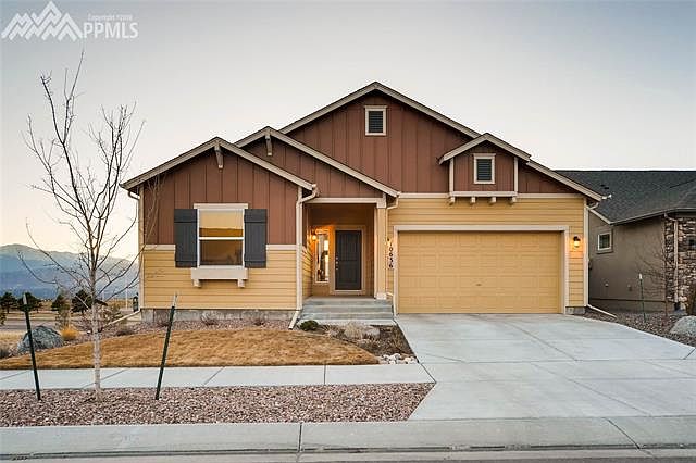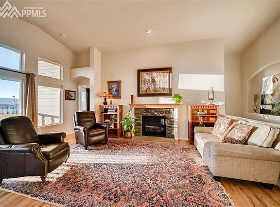 Unobstructed Pikes Peak and Front Range views from this gorgeous 5 bedroom home in the newer area of North Fork At Briargate. Hardwood floors throughout most of the main level with an arched cut-out and closet in the entryway. The gracious open floor plan has a vaulted great room that features a gas fireplace with a mantel and a walk-out to the covered composite deck, perfect for entertaining. The gourmet kitchen features a center island with bar seating, granite countertops, a walk-in pantry, stainless steel appliances and a spacious dining area with large windows to bring in views of the mountains. The vaulted master retreat features a large picture window for more views and a 5 pc. spa with a spacious walk-in closet. Two additional bedrooms with large double closets, a full size bath with a quartz countertop, and a laundry room with a window complete the main level. The lower level walk-out family room has plenty of natural lighting with large windows and yet more beautiful views. Completing the lower level are two additional bedrooms with double closets, one having an attached full size bath with a quartz countertop and tile flooring, a huge storage room that could be finished to meet your family's needs, and plenty of hall closets for tons of extra storage. Extras include; AC, sump pump, sprinkler system, window coverings, 2-car attached garage, and a great location near shopping, dining and less than an hour commute to the Denver Tech Center! Move-in ready.