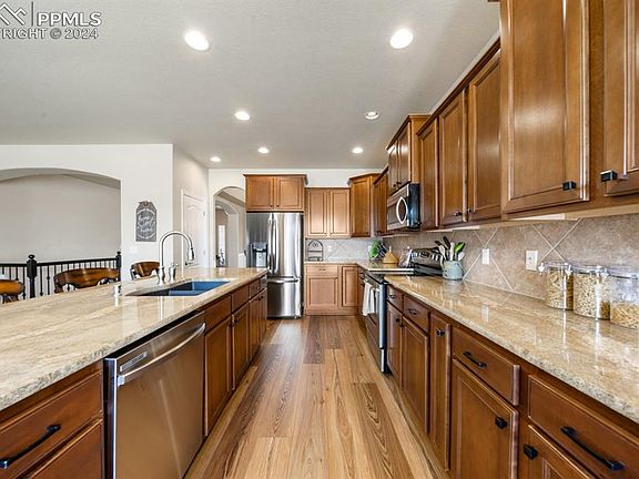 Welcome home! This like new ranch floor plan home, with a 3-car garage on corner lot, offers the perfect blend of luxury and comfort. The spacious floor plan seamlessly connects the various living spaces, creating an inviting atmosphere. At the heart of the home is the gourmet kitchen, featuring granite countertops, stainless steel appliances, a large kitchen island, dining area nook, and kitchen pantry. The kitchen flows effortlessly into the living and dining room areas, providing an ideal setting for gatherings and a cozy gas fireplace for those cool Colorado nights. The main level hosts the main bedroom suite, complete with a 5-piece bathroom and a large walk-in closet. Pamper yourself in the soothing deep soaking tub or rejuvenate in the separate stand-up shower. Two additional bedrooms, a second full-size bathroom, formal dining area, and laundry room complete the main level. Venture downstairs to discover a recreation room PLUS a Flex room that offers endless possibilities. Whether you envision a movie room, a playroom, a home gym space, or all, this space can adapt to your lifestyle. Two more spacious bedrooms, a full bathroom and wet bar provide additional comfort and functionality on the lower level. Step outside to the large fenced-in backyard, meticulously landscaped that offers both beauty and functionality. There is an oversized patio that beckons you to enjoy outdoors. Other features include, A/C, pre-plumbed for 2nd water heater, radon system, class 4 roof shingles and a large storage area. Enjoy this great Colorado Community Lifestyle and take advantage of these community amenities: Award-winning neighborhood golf course, 42,000-sq-ft recreation center - fitness center, full basketball court and indoor and outdoor pools, miles of gorgeous winding trails, shopping and dining right in the neighborhood! Neighborhood parks and a 215-acre regional park with Dog Park.* CLOSE TO PETERSON & SCHRIEVER SPACE FORCE BASE and a short drive to FORT CARSON*