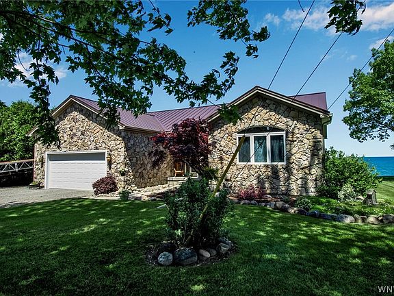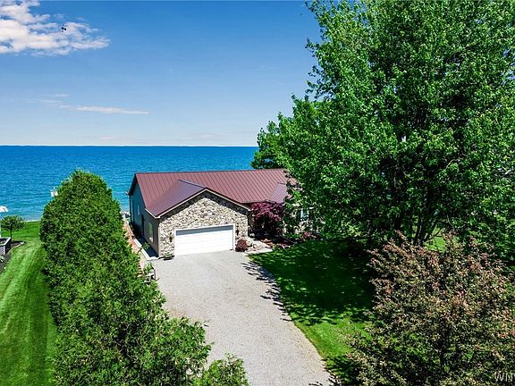 Wow! This is the one you have been wishing for! Stunning custom-built waterfront ranch on 1 acre. Home has been lightly used and meticulously cared for by the original owner! Beautiful water views from inside and out! Home features hardwood floors throughout, stone fireplace (gas), open floor plan, primary bedroom with bath and walk in closet. Cherry cabinets, 1st floor laundry, hot water baseboard heat plus split units for A/C, Generac system (2020), full dry basement. New metal roofs (2022)! Gutters with gutter guards. Fabulous sunrises and sunsets! Large Deck with awning. Attached 2 car garage plus 2 more detached garages! Fully protected lake frontage is concrete reinforced with rock (2019). There is also a concrete ramp and dock is included! Just 60 minutes to both the Rochester Airport and Buffalo Airports. This is a rare offering in a great location!