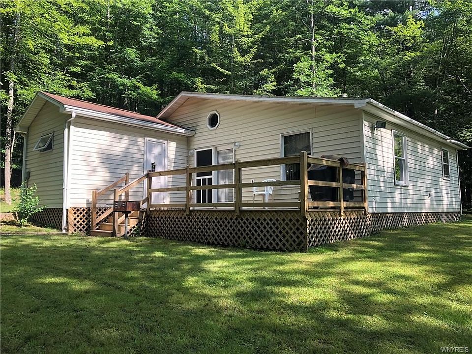 Perfect affordable get away! Turn key ranch style with 2 bedrooms, large living room with wood stove, large eat-in kitchen, roomy 8x25 front deck (8/2019), side deck (2017). On 30+ mostly wooded acres. Surrounded by wild life-deer, turkey, raccoons & even black bears! The land was timbered 26 yrs ago, earn more$-pine, hemlock, oak & hardwoods. Septic installed 2015, "overflowing" well 1997, could divert the extra well water & create a pond! Well insulated, extra electric baseboard heater in bedroom. Buried electric service & Dish network. Garage (20x16) w/electric & metal roof. "outhouse" is actually a tool shed. Wood burning stove is main source of heat (winterize after hunting season). Taxes have square footage split 360 (original mobile home) and 780 for the addition. Total of both is 1140. Original house was 360 square feet. Also listed under ML # b1282660Due to the extreme interest in this unique property, the seller is requesting all offers to be submitted by Thursday, August 6 at 9 am.
