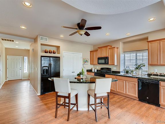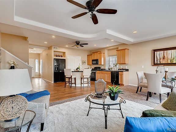 BEAUTIFUL HOME IN WONDERFUL COMMUNITY!!! You will LOVE the unique layout of this home!! Stunning floor plan with natural sunlight through out!! Updated kitchen with 42" cabinets, granite tiled counter tops, new refrigerator, large kitchen island, perfect sized pantry. The Beautiful kitchen opens up to the dining area and family room which is a great layout for for entertaining!! Main floor master suite with custom tiled walk in shower and HUGE walk in closet, his and her sinks. Additional bedroom on main floor with walk in closet and full bathroom. Upstairs features its own private suite with own media room/loft area, bedroom with large walk in closet and full bathroom! Enjoy the finished basement which features huge family room, additional bedroom and plenty of storage space. New Paint, new carpet, new fixtures through out! Walking distance to brand new Bison Ridge rec center, schools, bike paths and trails! Close to DIA, e-470 and hwy 2. Don't miss out on owning this GORGEOUS HOME!!