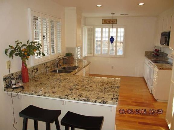 Light and bright townhome with beautiful hardwood floors throughout. Breakfast nook, granite counters, dining room, plantation shutters, vaulted ceiling and fireplace in the living room. Dual pane windows, wonderful backyard/patio with trellis, plenty of storage and 2 car garage. Open Sunday 1-4pm