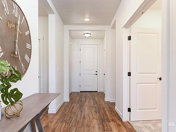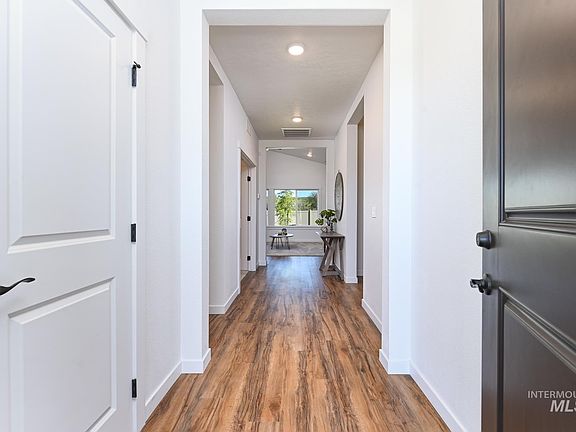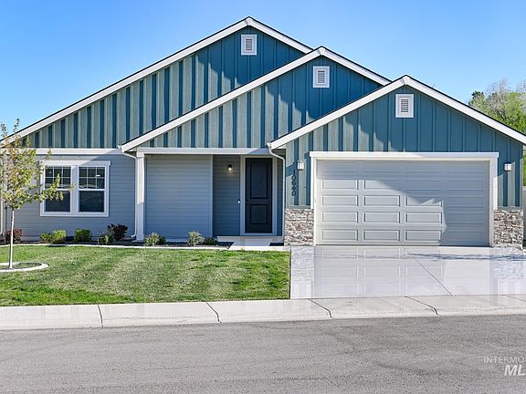 Built in 2022, this turnkey residence boasts an array of premium features designed to elevate your lifestyle. Step inside and you are greeted by beautiful LVP flooring, 9' ceilings, dedicated den/office & a modern aesthetic with bronze accents. The intentional floorplan seamlessly connects the great room with a stacked rock fireplace & hearth to the kitchen & dining nook. The upgraded kitchen boasts quartz counters, custom cabinetry, soft close drawers & SS appliances with a gas range. Unwind in your own private sanctuary with large soaking tub, tiled shower, dual sinks and an impressive walk-in closet. More than just a home, this residence is a testament to energy-smart construction, ensuring efficiency and sustainability with a HERS and Energy Star rating plus a fully insulated garage. You can enjoy all of Idaho's four seasons on your extended covered patio with no backyard neighbors offering the utmost privacy. Better than new! Complete with full landscaping & sprinklers plus upgrades galore!