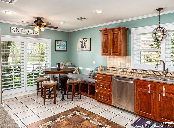 Beautifully maintained 4 BR, 2.5 bath (plus loft) home ft many amenities including decorator colors, plantation shutters, skylights in living room and bathrooms, updated bathrooms w/tiled shower, dream kitchen w upgraded cabinets, quartz counter tops & tile back splash, recessing lighting, mini water heater for instant service, banquette, gorgeous wood laminate floors, Recent roof & exterior paint, Large cov'd patio, Peaceful landscaped greenbelt backs onto 32 acre park w paved trails lot w/shed. Much more!