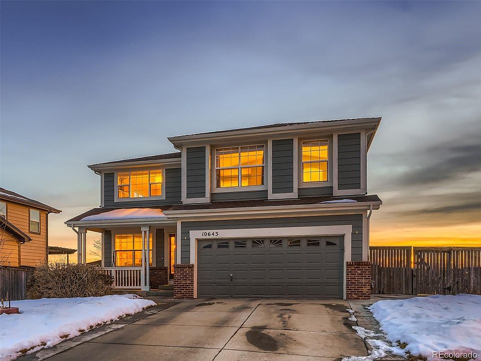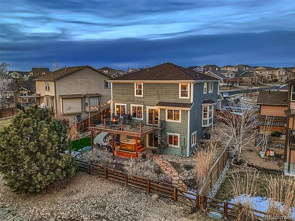Welcome to 10643 Joplin in Reunion. This spacious home backs to open space and has sweeping mountain views to enjoy Colorado's sunsets all year long. The formal living room and dining room leads to the sun-drenched kitchen and family room with a gas fireplace for those chilly nights. Upstairs you'll find four bedrooms including a 5-piece primary suite with walk-in closet. The upstairs loft is a great flex-space that could potentially be converted to a fifth bedroom. The walkout basement features a "Sports Cave" complete with a bar and keg-orator to watch the big game. Trex deck in the backyard highlights those amazing views, new hot tub on the patio below is negotiable. Cat5 installed for reliable internet speeds. 220v in the deep two-car garage, ready for your EV. New AC installed in 2021. Convenient location is close to walking trails, shops, and neighborhood schools.