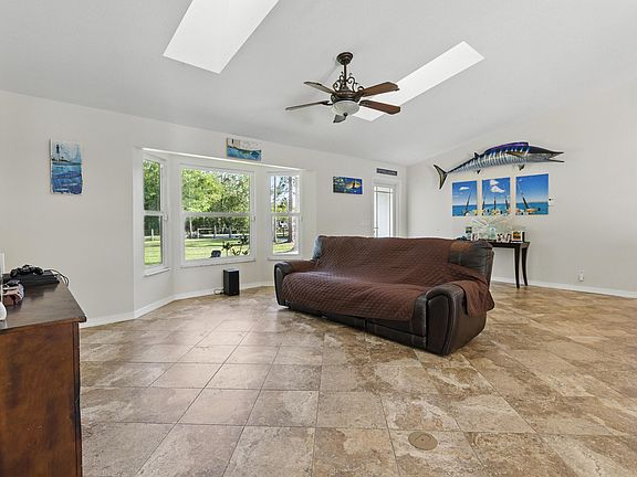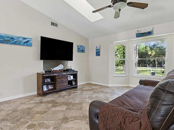 NO HOA , paved road! There is no wasted space in this Jupiter Farms home! The home features a split bedroom floorplan with an open concept living area, vaulted ceilings and nice natural light, open kitchen with stainless steel appliances, and oversized laundry room (currently being used as a 4th bedroom). Outside, you will find a freeform pool (Diamond Brite) and 1.25 acres of fully fenced yard. Previous owners used backyard for horses so there is a pole barn, storage shed, and room for 2 paddocks. Home has been upgraded with impact windows, skylights, and doors, and has a newer HVAC and roof (installed in the last 5-6 years). Fitted with a generator hookup that easily runs the A/C, pool and water pump, refrigerator, and more in the event of an electrical outage.
