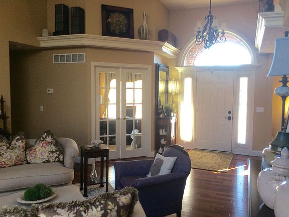This immaculate one owner custom built home is situated on a half acre+ lot in Eagle Crossing with wooded back drop and offers a backyard oasis with in -ground pool, abundance of patio surround, gorgeous landscaping, and large grassy area that extends beyond the fencing, and irrigation system. This beautiful home offers many recent updates per seller including newer roof, pool pump, garage door opener, and more. This 4 bedroom, 2.5 bath home, with 3 car side load garage is loaded with amenities throughout including hardwood flooring, extensive wood working including double crown molding and accent trimmed doorways, custom Amish built shelving, and much more. The foyer with soaring ceiling opens to the living room with 12 ft ceilings, double stacked windows, and fireplace with custom mantle and is open to the dining room. French doors open to the office with custom built-ins. This open floor plan offers a kitchen that will delight any cook with an abundance of custom cabinetry, large island with built-in wine storage, custom tiled back splash, spacious dining area, planning desk, pantry, and a raised breakfast bar with seating that is open to the spacious great room with wall of windows and access to the patio overlooking the yard and pool. The main level master suite offers a tray ceiling with double crown molding and French doors leading to the gorgeous outdoor space. The master bath features a double sink vanity, walk-in shower, and a large walk-in closet. The guest bath offers direct access to the pool area and outdoor space. The large laundry with sink, hanging area, and cabinetry is conveniently located off the 3 car garage. The second level has three additional spacious bedrooms with access to the full hall bath with double sink vanity tub/shower combo. This immaculate home is ready for summer fun at home and is just a golf cart ride away to Eagle Valley & Oak Meadow Golf Courses!