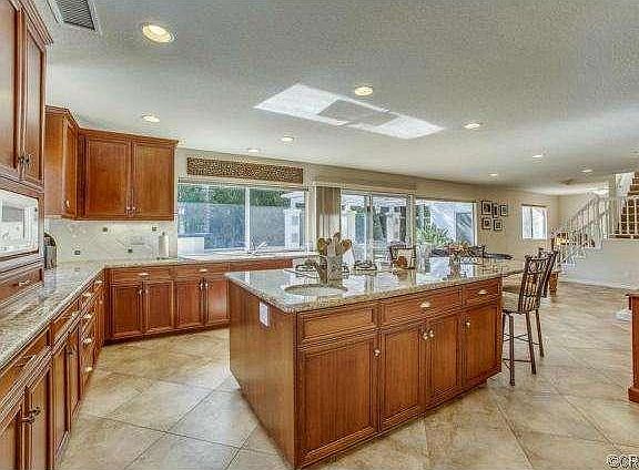 Situated on a picturesque 18,731 square foot lot in a sought after neighborhood of the Tustin Hills, this completely remodeled executive home boasts walls of glass that brighten every room and showcase the impressive yard with pool and mature trees. From a double door entry, gracious living encompassing 3,324 square feet includes a Great room and grand living room with wood floors and vaulted beamed ceiling that share a dual sided fireplace with glass rocks. The adjoining formal dining area is great for gatherings, and is adjacent to the fabulous gourmet kitchen with granite countertops, dual ovens, center island with second sink, stovetop and seating, and ample cabinetry for storage, is a culinary dream. Five bedrooms and 3.5 updated baths, include the upper level master suite with walk-in closet, luxurious bathroom with marble countertops. There is also a bonus/theatre room with elevated seating and surround sound, plus an office upstairs. The safety fenced salt water pool and spa with water features offers solar heating and newer equipment. Other outdoor highlights include a built in BBQ and bar area, a lighted covered patio ideal for dining outdoors, a sports court with basketball hoop and grass area. Arroyo, Hewes and Foothill schools.