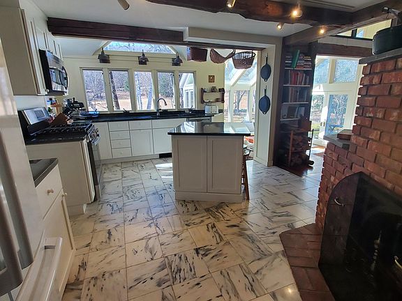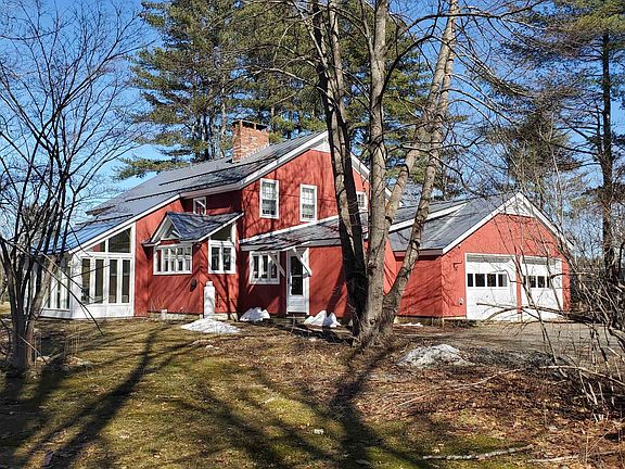 3 open acres just 1 mi. from Grafton village center, this unique home was designed and loved by its artists/owners. A large sunroom, open floor plan, cathedral ceiling with high windows and 2 brick fireplaces offer comfort in all seasons. Many interior walls are old barnboard with marble floors in kitchen and sun room. Recent owners have added a full new standing seam roof, a state-of-the-art furnace and oil tank and Tesla battery wall to take over in event of power outages. New sun room windows, and new washer and dryer, well pump and a cedar privacy fence along the road. 2 first floor bedrooms with a full bath, and overhead 2 additional bedrooms, an office, and 2 more full baths. Full basement is easily accessed via the attached oversized 2 car garage or the mudroom. Charming, cheerful, trouble-free home with a full yard dog fence, plantings and "room for a pony".