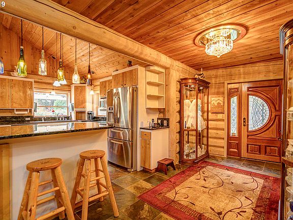 Amazing Custom-Built log home on 147 acres w/views of Umpqua River. Water source is well and Spring water. Inside has granite,slate,ceramic tile and red hardwood, open staircase to 2nd master suite, vaulted and soaring ceilings. Exterior guest house, 54'x 36' shop, two bay RV garage, fenced orchard. Abundant decking w/hot tub, huge gazebo and outside kitchen with bar, BBQ, refrigerator. Property fenced and has paved gated entrance.
