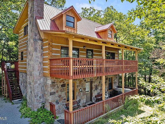Location! Location! Location** Turnkey property with 5 star reviews, 4 year rental history currently booked through 2022 and into 2023** 10 min to Gatlinburg, 20 min to Pigeon Forge, minutes from the Arts and Crafts district and trolly stop nestled in the Valley Ridge neighborhood. Smokey MOUNTAIN views is what tourists desire and you can enjoy them from the upper porch (views of Sky Needle lift and Gatlinburg firework shows in photos) Three stories high with sleeping and recreational accommodations on each floor allowing for space and privacy for multiple families. Middle floor features open living room with stunning river rock hearth and vaulted ceilings with eat in kitchen and bartop seating, bedroom and full bathroom. A third deck from the kitchen for grilling and outdoor dining. Lower level is the ideal recreational space with sectional couch, wood burning fireplace, and kitchenette. Lower level queen bed and full bathroom with access to patio and newer hot tub to soak away the crisp fall nights. Upstairs loft with two bunk beds and daybed, third full bath. New couches and beds in 2021. This mountain home is currently used as a 4 bedroom 3 bath cabin. Septic system overhaul in 2021 (invoices for work completed to be provided to buyer with accepted offer for records) Buyer has the option to opt into HOA for pool membership