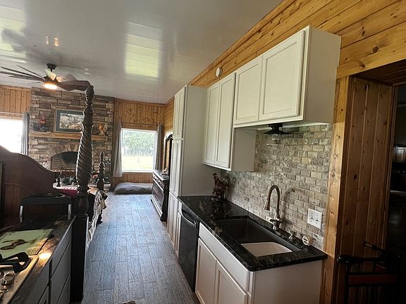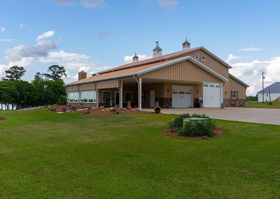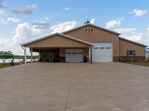 This cozy lake view property has everything you need in a peaceful setting on 10.71 acres. Red Iron Barndominium with steel exterior has 4250 sq. ft under roof, 3120 sq. ft heated/cooled. So many options here, live in the Barndominium while you build your dream home or add additional rooms or add a 2nd floor in the Barndominium. Beautiful open space with kitchen includes gas cook top, cabinetry, & farmhouse sink, granite counter top, stone fireplace, wood look ceramic tile, & big windows with breathtaking views. 1 bath room w/ walk in shower & large walk in closet. The property is completely fenced with gated entrance for extra security, 2 pastures, 16 pecan trees, lots of concrete nothing less than 6 in. thick. 2 large commercial door w/ commercial remote openers, 12x9 & 14x14 large enough for a full size RV. There is full RV hook up inside. 1 year old water softener. Property is irrigated. Deep well & septic tank. Additional 24x36 pole barn. There is area that was being converted into rooms but can easily be converted back for 2 stalls, wash area with hot/cold water, & storage area. The home has 5 cameras and surveillance on the property. This Barndominium has heavy insulation for energy efficiency. So many options here with the most serene views.