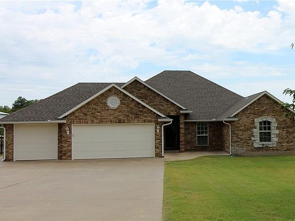 Have it all! This Beautiful 3 bed, 2 bath home w/ so many extras! It's on 3.25 acres! Outdoors an inground pool with slide, hot tub, gazebo, Camper port 30W X 35L MOL, oversized 3 car garage & storm shelter. A shared private pond w/ 2 neighbors stocked w/fish. This is a catch & release w/a 10 ft easement. There is a wooded area too but the whole property is not wooded, so you get a little of both worlds on this well kept property. Roof is 2 years old. Inside, High ceilings, crown moulding, wood window blinds, lots of wood work & storage. The kitchen has granite countertops, gas range, kitchen island & an automatic lit walk in pantry. Seller is leaving refrigrators in the kitchen & garage. The living area, kitchen & master overlook the pool. The master has a whirlpool tub, double vanity, large closet & shower. This is in a USDA area as well. Easy access to OKC, Norman, Mustang. The weeping cherry tree in the backyard & wall items in Bedroom 2 are reserved.