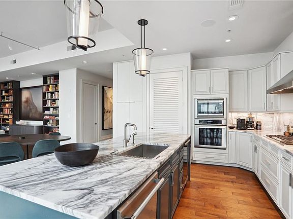 Discover sophisticated city living in this elegant corner unit, perfectly situated in the heart of Midtown. Thoughtfully designed with high-end finishes, this residence features wide plank hardwood floors, custom kitchen cabinetry, and exquisite marble countertops and backsplash. Custom closets, motorized shades, and other refined upgrades enhance both style and functionality. The spacious primary suite boasts soaring 12-foot ceilings, a spa-inspired ensuite bath with a soaking tub, and an abundance of natural light. Residents enjoy exclusive membership to the Exhale spa and gym, courtesy of the HOA, along with access to premier amenities at Loews. Two garaged, gated parking spaces provide convenience and security. With top-tier dining, shopping, and green spaces just moments away, this condo offers the perfect blend of luxury and urban convenience.