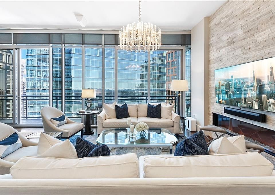 Contemporary fireplaceSweeping skyline viewsHardwood floorsOversized islandExpansive windowsNatural lightHeated rooftop pool
