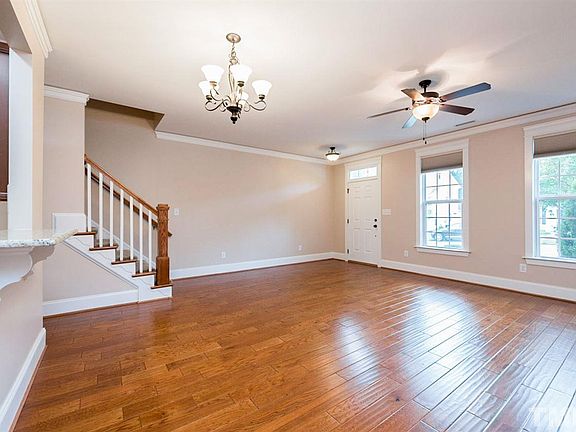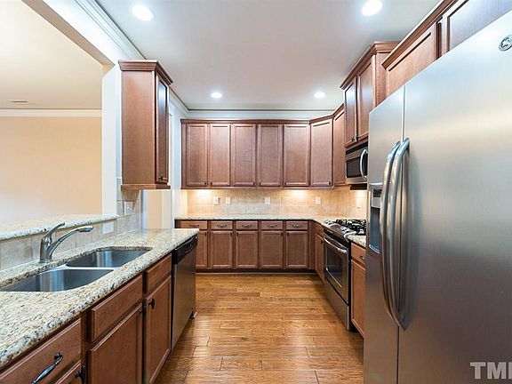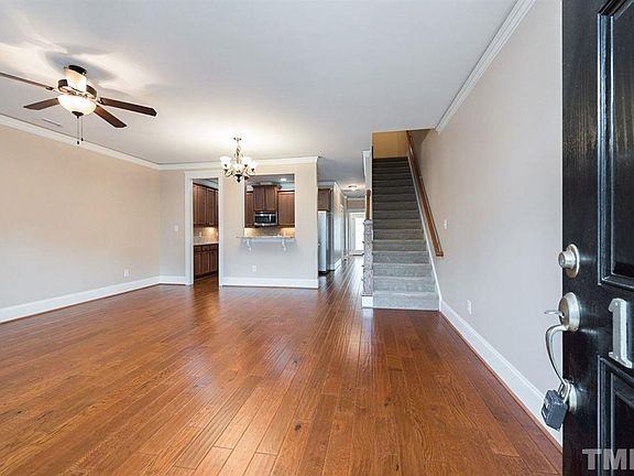 This Chapel Hill three-story townhome offers granite kitchen countertops, stainless steel appliances, master walk-in closet, master dual sinks with shower tub and combo, and a one-car garage.