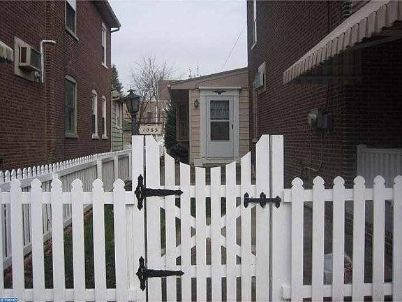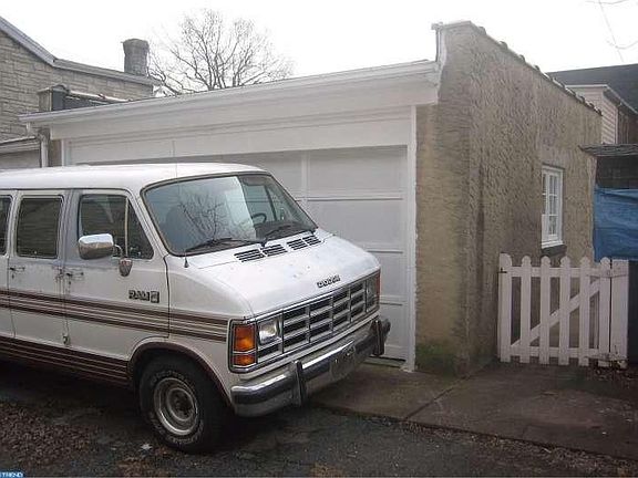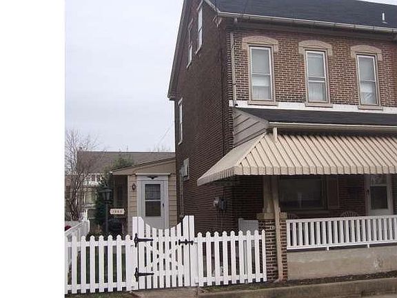 Great bedroom brick twin-home in "Pottstown" with a nice detached two car garage. Large front porch leads leads you to a living room entry which features a large living room with a beautiful wooden staircase and built in shelving, formal living room with corner hutch, laundry room and separate powder room. Kitchen has wood cabinets, stove and exit to rear covered porch. The yard is fenced and leads you to a nice two car garage that anyone would love to have. The 2nd floor has 3 bedrooms with closets and a full bath. The attic is finished with a closet, heated and does have windows. Some of the carpets cover hardwood floors but Buyer should look to satisfy themselves. Outside has a front and back covered porch, patio, fenced yard and a great two car garage with electric and garage door opener. Room Dimensions are approximate. Buyer should measure to satisfy self.