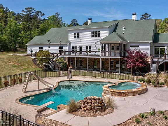 Rare opportunity to own a custom built country estate home with gorgeous swimming pool/spa on 24.78 beautifully wooded acres. Surrounded by manicured grounds with spectacular views of the acreage, home to a portion of pristine Rock Creek and with a private sporting field this very special property has it all! Enter this gracious home with a two story foyer, view to the oversize great room with stone fireplace and the outside decks / swimming pool complex beyond. The owners suite on main level a features a private sunroom, jacuzzi tub, fireplace, large private bath and double walk-through dressing/closet areas. Main level also offers a large dining room, a library/office and a gourmet kitchen open to the great room with a spacious breakfast area, counter seating, kitchen island, marble counters and top of the line custom cabinetry. Also on main are three more very spacious bedrooms, each with their own en-suite, tiled baths. Upper level offers a second great room, and a fifth large bedroom with tiled / full bath. The stunning in-ground pool complex was custom designed with a waterfall from the elevated/heated spa, stone detailing, a diving board and a water slide. For the sporting life - enjoy our own cleared sporting field for baseball, camping, archery or other outdoor activities, with electric and water accessible. The unfinished basement with views to the pool area, has been framed out, stubbed for a bathroom and offers another entire level of space for the buyer with vision. Ideally located in an upscale residential area of larger homes on acreage, short minutes to Hard Labor Creek State Park/lake/golf course, to I20 and historic Rutledge and Social Circle town centers for shopping and dining.