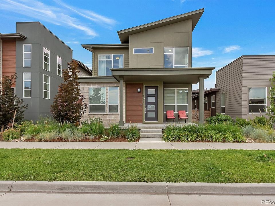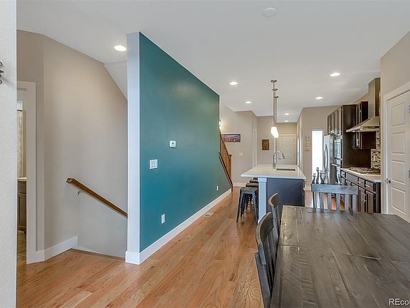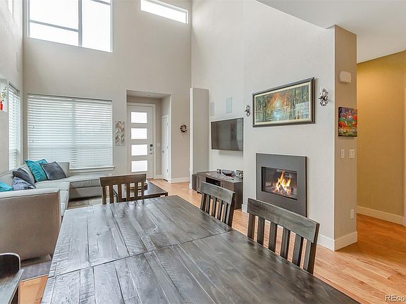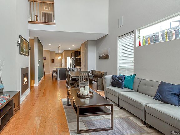 The entrance into the house is filled with natural light from large windows and high ceiling. Open floorplan between living room, dining room and kitchen. Office off the front entry with large windows. Main floor master bedroom with vaulted ceilings and hardwood floors. Large master bath and walk-in closet with built-in wall safe. Chefs kitchen includes gas cook-top and hood, stainless steel appliances, beautiful backsplash and large island with quartz countertops. Living room includes gas fireplace and built-in sound system. Pre-wired sound system and natural gas hook-ups in private backyard. Attached 2 car garage with electric car charging station. 0.5 miles to new King Soopers and Eastbridge shops. 0.8 miles to Stanley Marketplace. Close to rec center, pool and parks. Close access to I70, I225. Short commute to downtown and DIA.