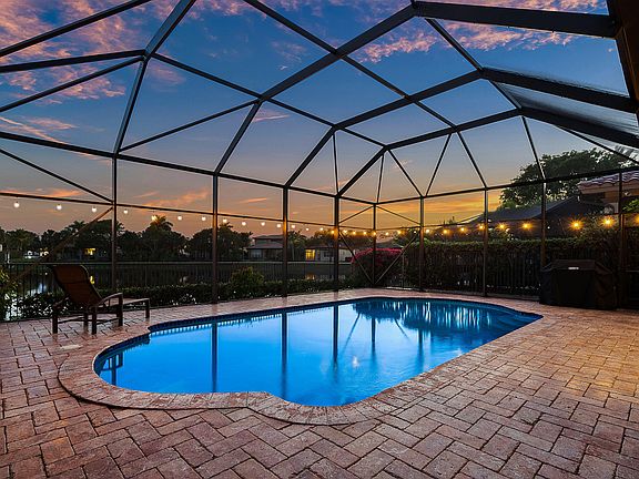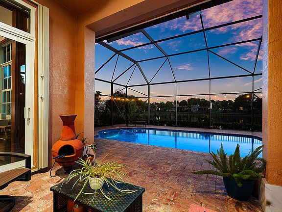 An ideal floor plan offering the convenience of a first-floor master suite and guest bedroom, with three additional bedrooms upstairs, perfect for families of any size. The home's exterior is equally impressive, with beautiful travertine decking both front and back. The professionally landscaped grounds, updated in 2024, feature native and non-invasive plants, along with a mature mango tree that provides both beauty and bounty. This stunning lakefront retreat is perched along one of the community's widest lake views, and seamlessly blends indoor and outdoor living with an oversized screened-in pool that serves as your private oasis. While inside the soaring high ceilings flood the space with natural light, creating an airy and inviting atmosphere throughout. The completely remodeled gourmet kitchen stands as the heart of the home, featuring high-end appliances and contemporary finishes that will inspire your inner chef.