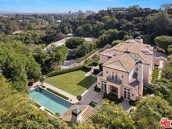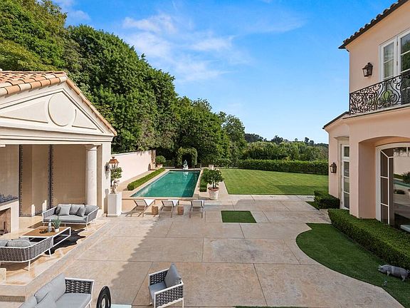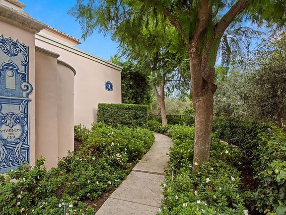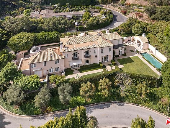 Architecturally designed for world-renowned interior designer Erika Brunson by Bob Ray Offenhauser, "Vivenda da Lua" (House of the Moon) is offered for the very first time. A magnificent Spanish Portuguese villa of exceptional beauty, this rare Bel Air estate is a study in timeless luxury. Three-story main residence and attached guest suite are set behind gates surrounded by manicured grounds, a pool and poolside pavilion, spacious patios, verdant lawns, and formal gardens. Breathtaking gallery has columns of crema marfil marble, grand mural by Doug Riseborough, and finishes by artist Peter Wolfgang. Ten-foot double doors were made from the highest grade wood, fireplaces were hand-picked in Paris, and tiles were designed by Erika Brunson and fabricated by Rigo in Portugal. Magnificent library finished entirely in fine walnut, spectacular gourmet kitchen, temperature-controlled wine room, movie theater, Zen room, upstairs kitchenette, mirrored gym, cupola-topped sweeping staircase, and an elevator.