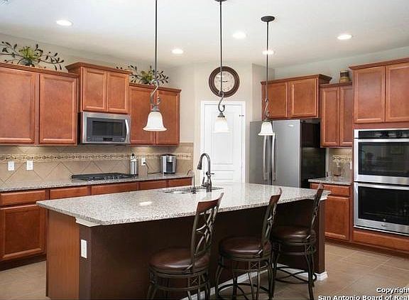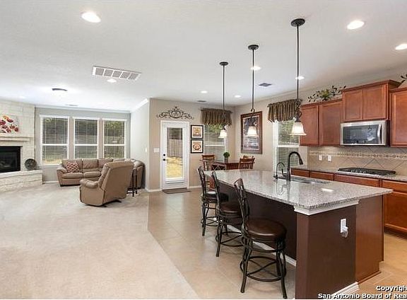 Amazing home in the desirable Lantana Oaks subdivision. NISD schools and located in the small town of Helotes. Wonderful oversized lot with great curb appeal. Open floor plan with many upgraded features. Master suite is downstairs and has a step-up ceiling, crown molding, bay window, double vanity, separate tub & shower. Other features include: stainless steel appliances, granite counter tops, double oven, gas cook top, island, tile back splash, tile floors, custom rock fireplace, high ceilings, beautiful stair railing, large loft area upstairs, faux window blinds, oil rubbed bronze fixtures, 3-sides brick & rock, patio cover, fire pit and oversized manicured yard. Come and make this your next home....Won't last!!