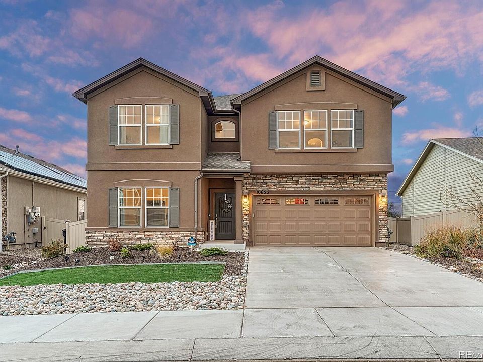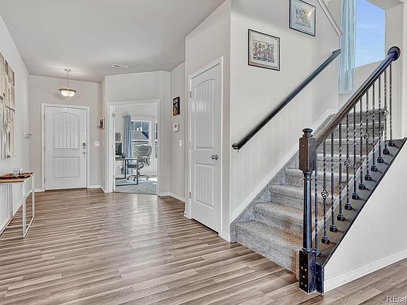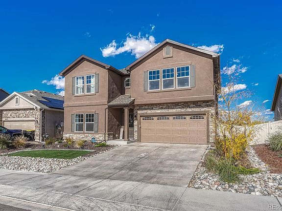 Spacious 2-story home that backs to trails and open space in the Fountain neighborhood of Ventana. Open floor plan with 9 ft ceilings and large living spaces great for entertaining. Beautiful wood laminate floors through most of the main level. Neutral carpet. Central air. Wide Entry with wrought iron stair rails to the upper level. French doors off the Entry lead into the spacious home office/main level bedroom. Main level Powder Bathroom with tile floor and pedestal sink. The Great Room is pre-wired for a ceiling fan, has a window to the backyard, and conveniently flows into the Dining Area and Kitchen. The Dining Area provides a slider out to the backyard patio. The Island Kitchen features a pantry, a counter bar, pendant lights, and espresso cabinets with granite countertops. Stainless steel appliances include a smooth top range oven, built-in microwave, dishwasher, French door refrigerator The upper level hosts a Loft/Family Room, Laundry Room with washer and dryer that stays, 3 Bedrooms with walk-in closets, and two Full Bathrooms. Double doors open into the Primary Bedroom that has neutral carpet and an adjoining 5pc Bathroom. The Bathroom has a tile floor, dual sink vanity, soaking tub, and tiled shower. Two more upper-level Bedrooms share a Full Bathroom with tile floor, vanity, and tiled tub/shower. Extras include: security system with cameras, video doorbell, and curtains with rods. 2-car attached garage with door opener. The fenced, level backyard features auto sprinklers, grass, and a concrete patio for outdoor relaxation and entertaining. Open space behind the home offers great privacy. Enjoy the Community Rec Center that includes a pool and a gym. Close to Metcalf Park, schools, shopping, soccer field, and hiking/biking trails. Easy commute to Ft Carson.