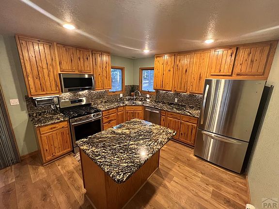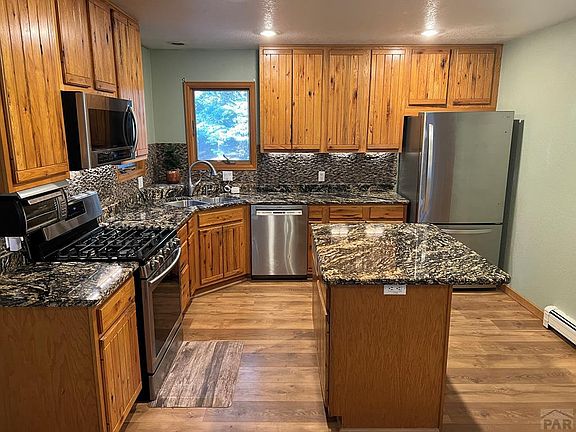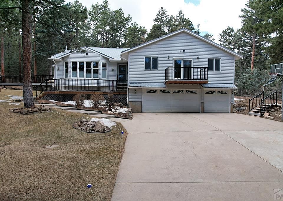 Come check out this spectacular Colorado mountain home that sits on a secluded 1.88 acres. This tri-level home boasts an open concept main space, new flooring, 3 fireplaces, and a HUGE master bedroom! As you step into the home the first thing you notice are the tall ceilings and large living room with a huge bay window. Up the stairs on the left you will see a spacious kitchen with wood cabinets and beautiful granite countertops. As you work your way down the hallway you will see a full bath, both extra bedrooms and a linen closet. Take the right at the end of the hall and take a few steps down into the 700+ sq ft master bedroom with a large walk-in closet, free standing gas fireplace, and a private full bath. The basement is fully heated and there is a room that could be used as a 4th bedroom or family room as well as two other large unfinished spaces that provide plenty of storage or you could add more bedrooms. This home has an attached 3 car garage, Anderson windows, all wall mounted televisions and the hot tub are inclusions. When you are in the backyard be sure to walk the trail behind the house on the property and cross the bridge to the back of the property! San Isabel National Forest is just a few miles away where locals enjoy fishing, kayaking, hiking, sledding, and numerous other outdoor activities! Local amenities include churches, a grocery store, banks, medical providers, restaurants, shopping, and the HollyDot Golf Course.