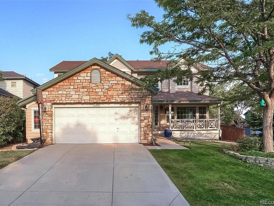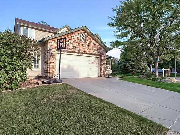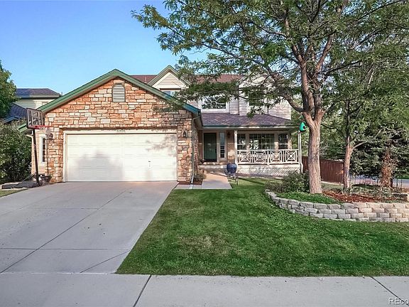 Welcome home to Stonegate. This light & bright 2-story home is greets you with a beautiful entry that effortlessly flows into a formal living & dining space, great for entertaining. Home cooks will love the well-appointed kitchen boasting white cabinetry, SS appliances, granite counters with center island & stunning hardwood floors. Cozy up by the fireplace or enjoy family movie nights in the inviting family room with built-ins & a new sliding glass door leading to your backyard deck. Main floor bedroom is great for guests or to use as a home office or playroom. Retreat to your huge primary bedroom with grand vaulted ceilings, sitting area, walk-in closet & ensuite 5-piece bath. 3 additional bedrooms & a double sink Jack and Jill bath round out the upper level. The unfinished basement with 9' ceilings is framed & plumbed, ready for you to make it your own or use for additional storage. Enjoy relaxing on your private backyard deck overlooking professional landscaping, raised garden beds & flourishing apple tree. Ideally located on a corner-lot in in a family friendly cul-de-sac with mature trees and minutes from Douglas County schools, downtown Parker, walking trails, shopping & dining. All new Champion energy-efficient windows upstairs & new HVAC. Hurry to book your showing today!