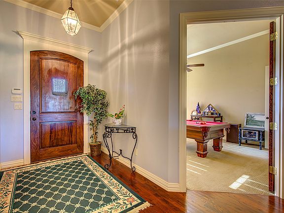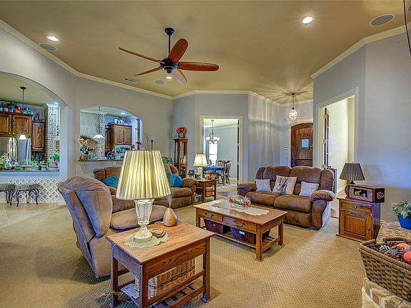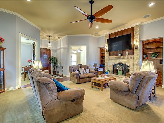 Additional highlights include two living areas, two dining rooms, and a 5th bedroom or office conveniently located near the Owner's Retreat. The gas-log fireplace adds warmth and charm, while the oversized three car garage provides ample space for vehicles and storage. Built with all the bells and whistles, this home exemplifies custom quality and comfortable sophistication.