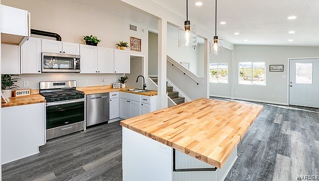Welcome to your own paradise at the edge of The Golden Valley, with nothing but pristine wilderness right across the street! Boasting at almost 2,000 sqft, this spectacular home is a 4 bed/2 bath, with the kitchen being the heart of the home. Walking through the front door you will immediately notice the impressive features this home offers BRAND NEW stylish and sleek gourmet kitchen with butcher block countertops, new cabinets, new SS Appliances, including, dishwasher, microwave, oven, garbage disposal and all new faucets throughout, freshly painted inside & out with a NEW METAL ROOF!! New electrical wiring, new plumbing, mostly new drywall, new windows, doors and slider, new vinyl plank wood flooring, including stairs, HUGE covered patio, a new electric water heater, & a new hauled water tank! Don't miss the 360 degree desert views by day and stars lighting up the sky at night!