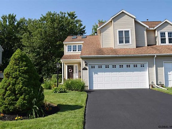 Just move in to this 1,455 SF, 2 bedroom plus a spacious loft, 1.5 bath, end unit townhome in Grandview Estates...convenient to I-90, RPI Tech Park, HVCC, and Route 4 shopping and restaurants. You will enjoy entertaining or relaxing on the deck overlooking the private yard with a wooded border. There are two raised garden beds for vegetables or flowers! Built in 1993, this home features a 2 car attached garage, a full basement, a new driveway in 2017, updated Andersen wood double pane windows including the addition of 3 windows, natural gas hot air heat and central air conditioning, and an updated roof in 2008. There's a 2-story foyer with a coat closet and ceramic tile flooring. Features a wood burning fireplace in the living room and a sliding door from the dining room to the deck and yard. The living room and dining room offer hardwood flooring and ceramic tile flooring in the kitchen. Theres overhead and pendant lighting in the kitchen; kitchen appliances are included: GE gas range, Frigidaire Gallery refrigerator, GE microwave, and newer GE dishwasher with stainless steel interior. There is also a pantry or coat closet at the entrance to the garage and the partial bath on the main floor features ceramic tile and a single sink vanity. The 2nd floor bedrooms and loft feature hardwood flooring with ceramic tile in the full bath also with a single sink vanity, linen closet, and fiberglass tub/shower. The master bedroom features two walk-in closets and a private, 2nd entrance to the full bath. Bedroom 2 features a double door closet. The loft is perfect for a home office or recreation space. There is a full basement with a laundry area; the LG front load washer and dryer are included in the sale. Excluding the bathrooms, this home was freshly painted throughout including the garage and all ceilings in 2019. Grandview Estates is a townhome community with no HOA fee.