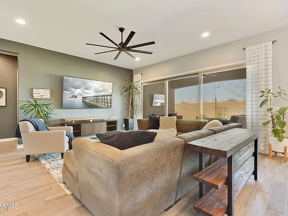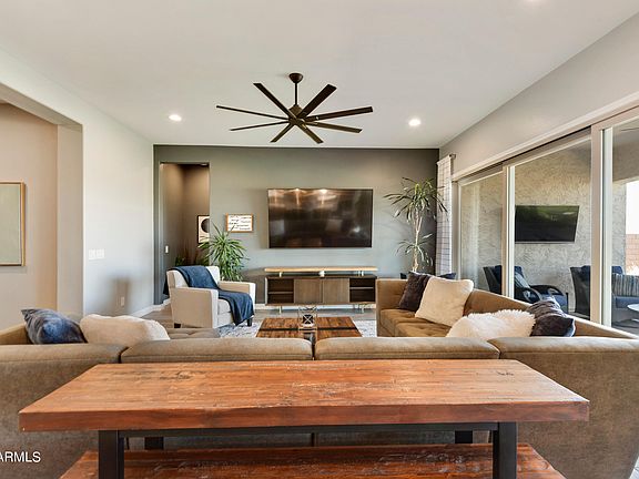 Voted Best Home On Tour!! Immaculate well-appointed with a dramatic entry that flows to large great room with glass walls looking out to your lush backyard. The gourmet kitchen boasts a massive island with upgraded appliances, walk in pantry, port windows, gas range, quartz counter tops, and custom back splash. All three guest bedrooms are ensuites and have walk in closets. The flex room is perfect for a media room or teen room. The luxurious master bath has a super shower, his and her vanities, large walk-in closet and a private water closet. Back yard has professional landscape with turf and backs to greenbelt. This Gem is located in Eastmark Estates and includes a heated pool, club house, gym and more. Three car garage so bring the toys. This home will not disappoint you!