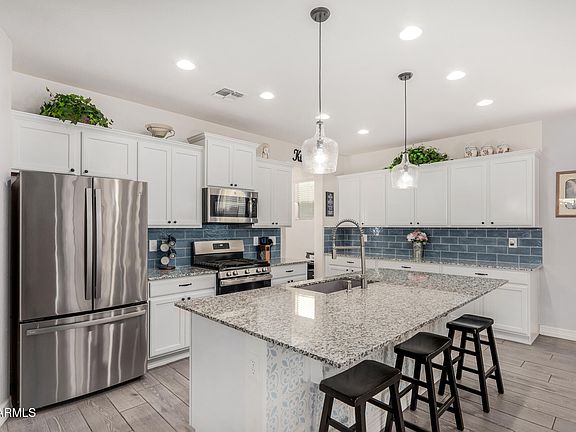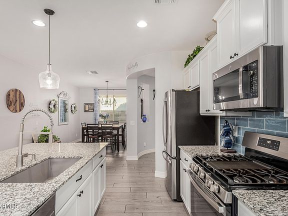 A beautiful 2 bed, 2 bath residence in Encore at Eastmark is now for sale! Featuring charming curb appeal, a low-care landscape, 2 car garage, and a paver driveway, it's sure to be the home for you! Discover formal dining & living areas w/wood-look tile flooring and neutral palette throughout. The fabulous kitchen is comprised of ample cabinetry w/crown molding, granite counters, tile backsplash, SS appliances, pendant lighting, SS appliances, HUGE island/breakfast bar. Primary bedroom showcases a walk-in closet and a private en-suite w/dual sinks plus a sliding barn door. You'll also find a cozy den perfect for an office or reading nook. Also including a lovely backyard, covered patio and artificial turf, this home is a true gem! Don't miss out!