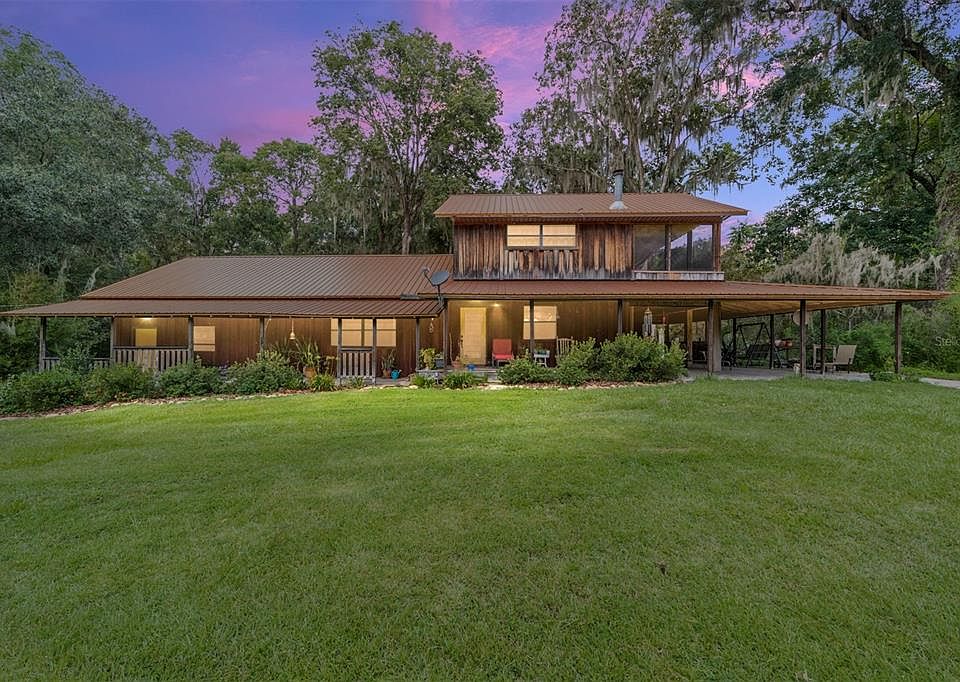 Serenity and convenience await in this picturesque 10-acre property featuring the best of both worlds located only 20 minutes from Gainesville, Shands, and UF, but with the benefit of Marion County property taxes. The tucked-away location provides quick access to work, shopping and entertainment, while offering abundant privacy and quiet at home. A nature lover’s paradise with mature trees, the property includes both wooded and partially open land with scenic views in every direction. An expansive porch wraps around two sides of the home, making it the perfect spot to watch the sunrise or relax at day’s end. Designed for comfortable living, the huge great room with high ceilings was made for gathering with family and friends. The updated kitchen boasts generous storage and a substantial island with plenty of room for meal prep. You’ll enjoy entertaining in the dining area enhanced by a cozy corner fireplace and there's room for a large table near spacious windows overlooking the property. The sizable pantry was converted from a half bath; all plumbing and electrical remains in place should you choose to return it to that use. A welcoming in-law suite just off the kitchen includes a full bath. Two upstairs bedrooms share a bathroom and provide access to an inviting screened-in porch where you can listen to songbirds greet the morning or slip away for an afternoon nap. The large garage has an oversized door to accommodate a small RV or fifth wheel or extra space for workshop projects. This peaceful country home promises the ideal location for an adventurous family, or anyone seeking a tranquil setting close to the conveniences of town.