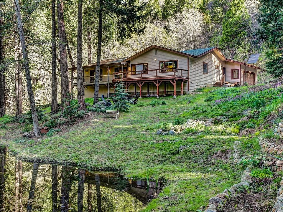 A peaceful private nature-lover's mountain /forest property. 24+ acres of beautiful forest and native dogwoods, a meadow of flowers meets the edge of the stream-fed pond that can be seen from the covered deck. Dual pane windows, well-insulated SIP paneled walls and roof keep this home comfy. The wood stove heats the central area with forced air heat as the back-up. Solar PV plus PGE and a 13000Watt Cummins industrial sized generator, propane powered from one of the two owned propane tanks provides the power. A constant flow of springs keeps the property lush and green. Built in 2006 with custom cabinetry, custom counter tops, pine vaulted ceilings, bamboo flooring and beautiful stain-glass craftsman light fixtures and so much more! Built to be self-sufficient with plenty of back-ups. This property is close to trails and skiing, yet only 15 min. from Nevada City. It's a mindful resting spot for all who visit. Come take a look, you'll be amazed!