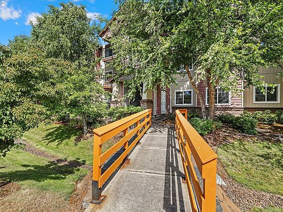 Bright and clean condo in prime location! Primary suite w/walk in closet and ensuite bathroom. Open concept kitchen, dining and living space opens to private deck overlooking tree lined street and picturesque footbridge. Storage closet on deck. New water heater, updated shower fixtures and faux wood window blinds added in 2022. Stacked washer/dryer and fridge included. Nature trail entrance right down the street. Minutes to Max, Intel, Tanasbourne shopping center, dining and more!