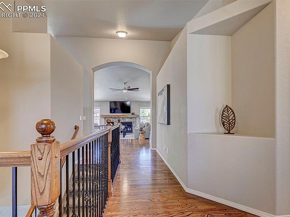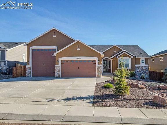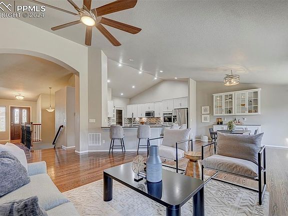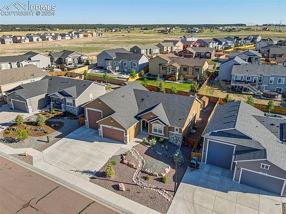 Stunning ranch home with no HOA!! The home boasts four bedrooms, four baths, and an open floor plan. Walking up to the home a beautifully landscaped yard draws you in. Through the front door the entry foyer leads to an open floor plan where the living area and kitchen flow together seamlessly. The living area has an incredible fireplace with stone accent and wood mantle. The kitchen wows with modern cabinetry, ample counter space, breakfast bar, center island, gas cooktop, double oven, and pantry. The dining area is just off the kitchen and provides walk-out access to the backyard. The first floor has two bedrooms and two baths including the master suite. The master suite is spacious with large windows illuminating the space with natural light. The ensuite bath has an incredible free standing shower, double vanity, soaking tub, and large walk-in closet. The second bedroom on the main level is also an ensuite with modern fixtures and vanity. Just beside the second bedroom is a wonderful office, making it the perfect space for remote work. The basement level is well lit and has a spacious family room with an incredible wet bar. Just off the family room a home theater that wows making this home ideal for entertaining. The basement also has bedrooms three and four and a third full bath. The backyard impresses with stunning landscaping off the cement back patio. The yard is partially xeriscaped for low maintenance and has a pergola and shed. Lastly, an oversized RV heated garage with concrete laminate vinyl holding up to 44,000lbs makes this the home that has it all and is located just a short distance from all the shops and restaurants Falcon has to offer.