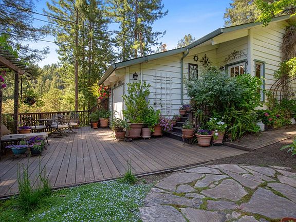 Experience the finest parts of Santa Cruz Mountain living! This beautiful property has full sun, serene views of the surrounding nature, and fantastic quiet privacy inside and out. The home has been elegantly decorated with Old World Style European accents. Open kitchen and dining areas have high vaulted ceilings, river maple floors, and a gorgeous kitchen island separating the spaces. Master bedroom and office room are located upstairs. Other bedrooms and laundry are downstairs. Separate office and bonus rooms. Anderson french doors opens to the huge back deck with al fresco dining and a spa area. The property has terraced walkways from the secret rose garden and deck areas, to vegetable garden beds and a lower level with a fruit tree orchard. Attached shop space is great for storage, toys, or hobbies such as brewing! Private road and well water. Just 4 minutes to grocery store, Italian bakery, restaurants and easy commute to Silicon Valley.